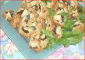 Preheat oven to 400F. Line standard muffin pan or 24 tart molds with the puff pastry. Prick the bottom on the pastry with a fork and weight them with dried beans or tart weights. Bake pastry for 8-12 minutes, until it puffs and becomes very light, golden brown. Cool on a wire rack, set aside. (If using pastry cups, skip this step.)