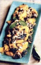 In a large bowl, toss and coat the squash chunks with the remaining 2 tbalespoons of olive oil. Season with white pepper, salt and a touch of nutmeg. Add the mushrooms, lightly toss and transfer the mixture to the prepared roasting pan. Tightly cover the pan with foil and bake for about 35 minutes. Remove the pan from the oven, discard the foil and and stir in the parsley, sage and rosemary. Sprinkle the squash with the hazelnuts and return to the oven and roast, uncovered, for 10 minutes.